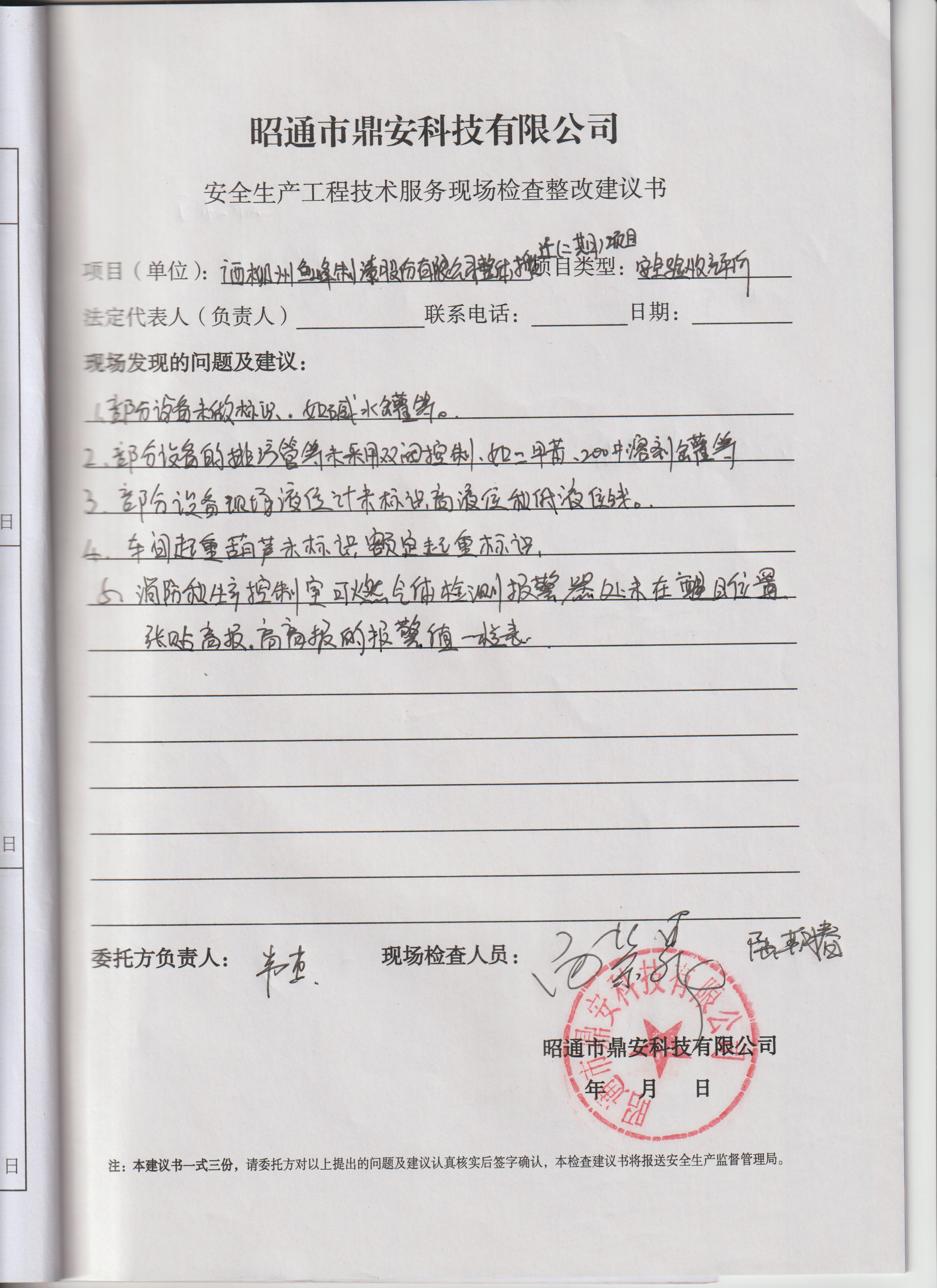 整改措施建議:1、應(yīng)定期請(qǐng)有資質(zhì)的防雷防靜電檢測(cè)單位對(duì)防雷裝置、防靜電裝置進(jìn)行檢測(cè),發(fā)現(xiàn)問題及時(shí)處理。2、定期對(duì)生產(chǎn)廠區(qū)內(nèi)的消防設(shè)施進(jìn)行檢查,對(duì)消防器材和應(yīng)急物資進(jìn)行經(jīng)常性維護(hù)和保養(yǎng),以保證其有效性。3、對(duì)從業(yè)人員發(fā)生崗位變更的,應(yīng)重新進(jìn)行安全教育培訓(xùn),并經(jīng)換崗考試合格后持證上崗等。 | ||||||||