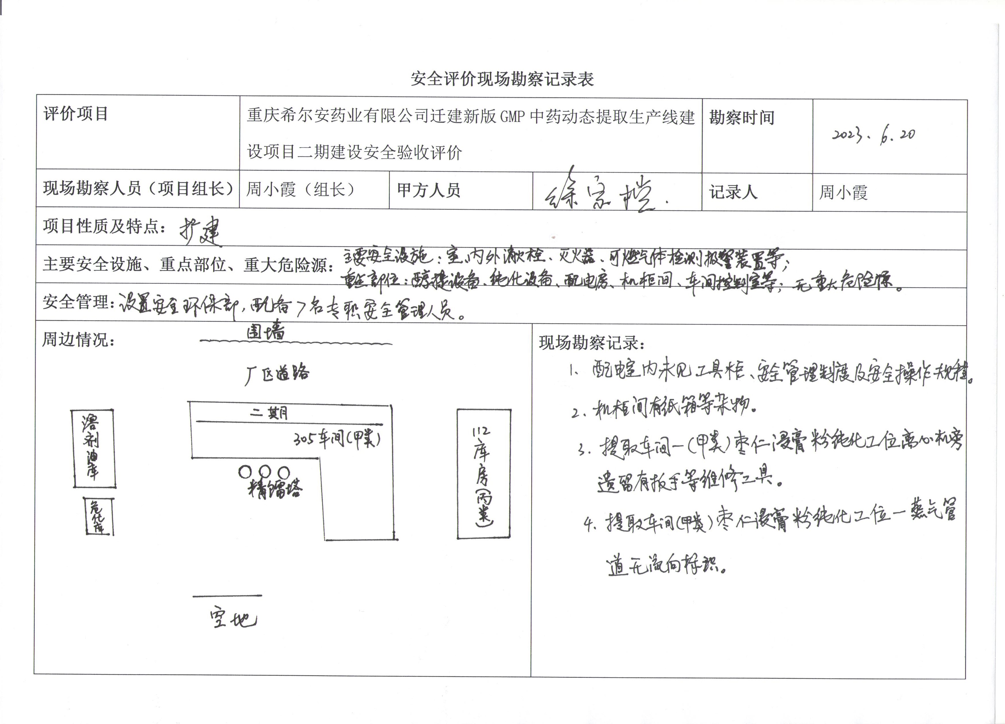 項目名稱 | 重慶希爾安藥業(yè)有限公司遷建新版 GMP 中藥動態(tài)提取生產(chǎn)線建設項目二期建設安全驗收評價 | 合同編號 | DA(渝)-PJ-20221009 | |||||