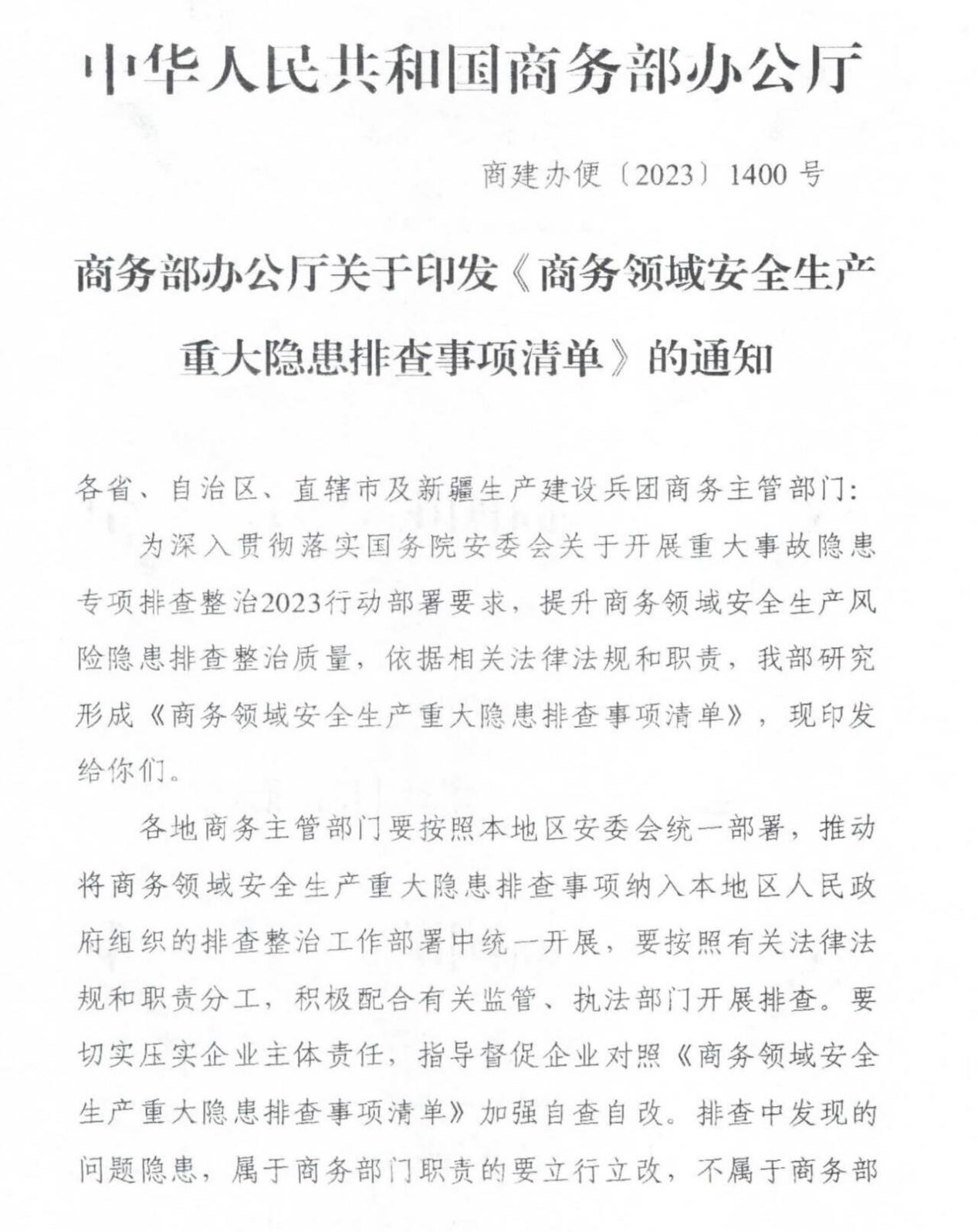 商務(wù)領(lǐng)域安全生產(chǎn)重大隱患排查事項(xiàng)清單