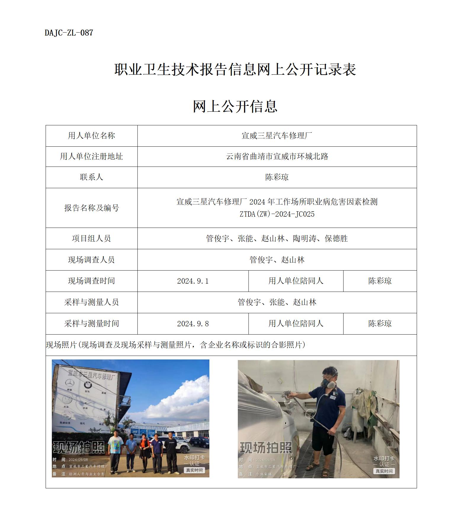 宣威三星汽車修理廠2024年工作場所職業(yè)病危害因素檢測 ZTDA(ZW)-2024-JC025