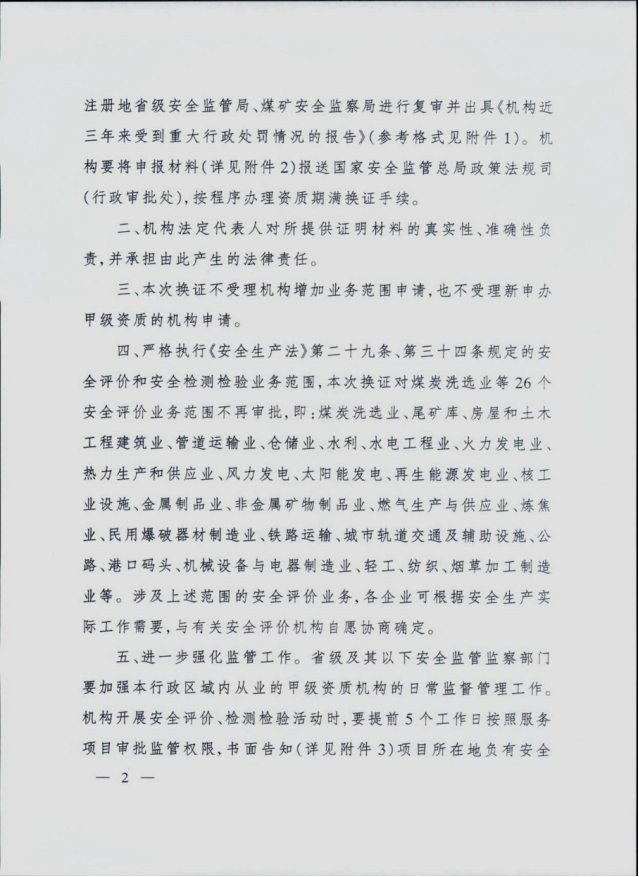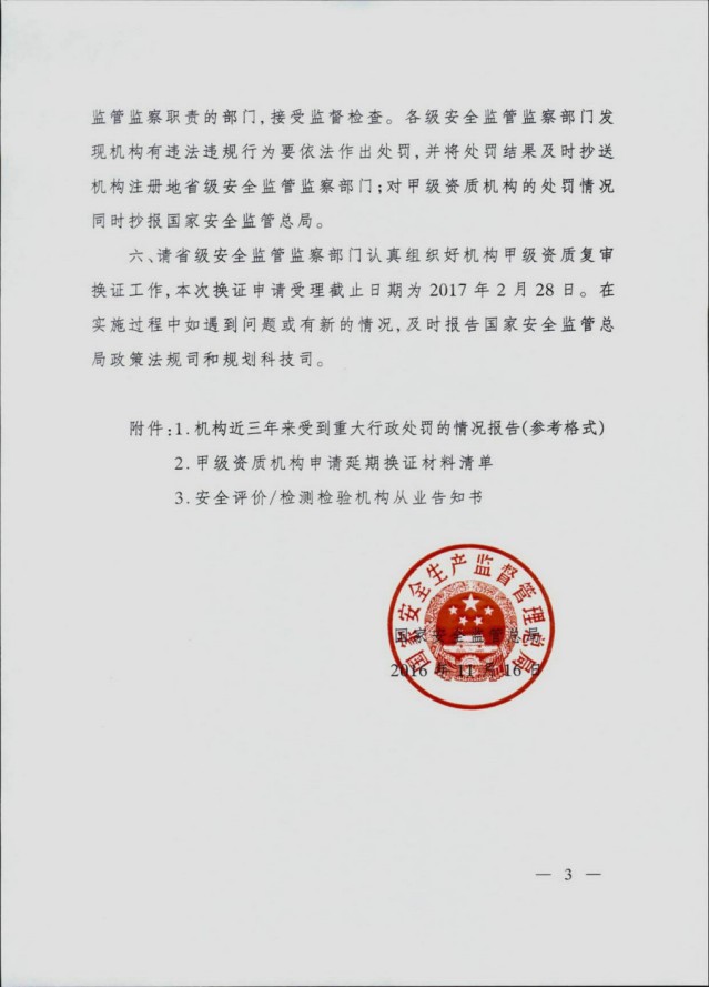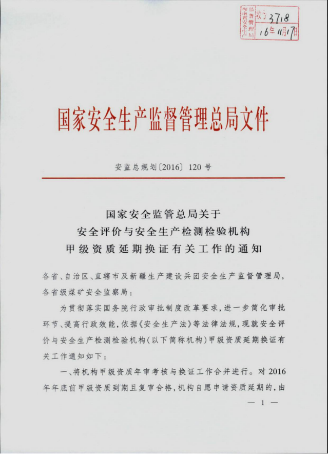 《國(guó)家安全監(jiān)管總局關(guān)于安全評(píng)價(jià)與安全生產(chǎn)檢測(cè)檢驗(yàn)機(jī)構(gòu)甲級(jí)資質(zhì)延期換證有關(guān)工作的通知》