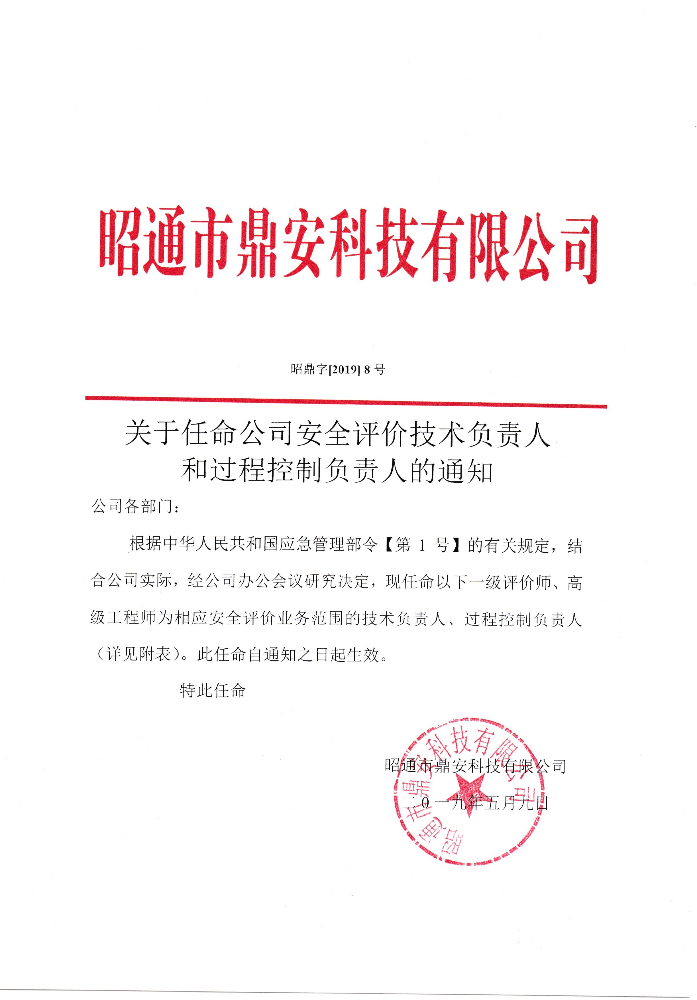 關(guān)于任命公司安全評價技術(shù)負責人和過程控制負責人的通知